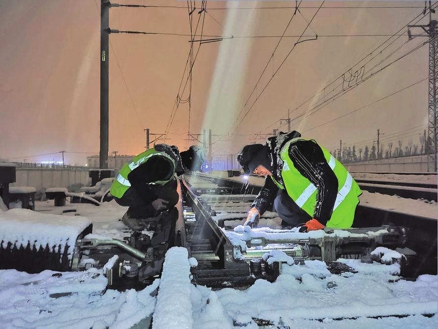 丽香铁路上,两名维修工使用融雪新装置,让道岔转辙设备得以顺畅运转。 通讯员 唐晓龙 摄