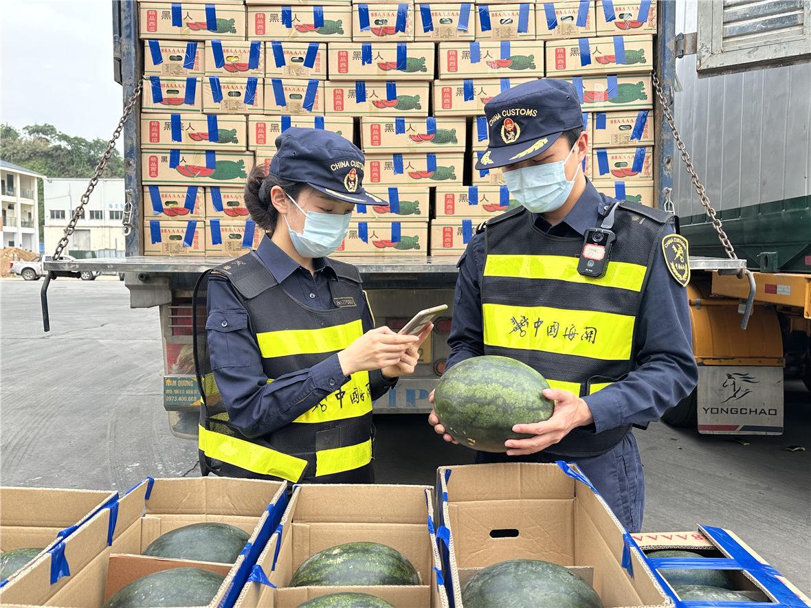 海关关员在河口公路口岸对进口越南水果开展查验。昆明海关供图
