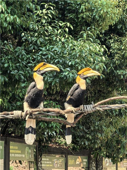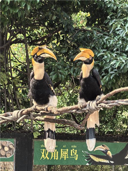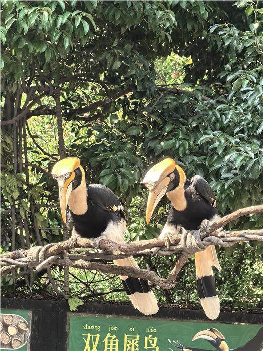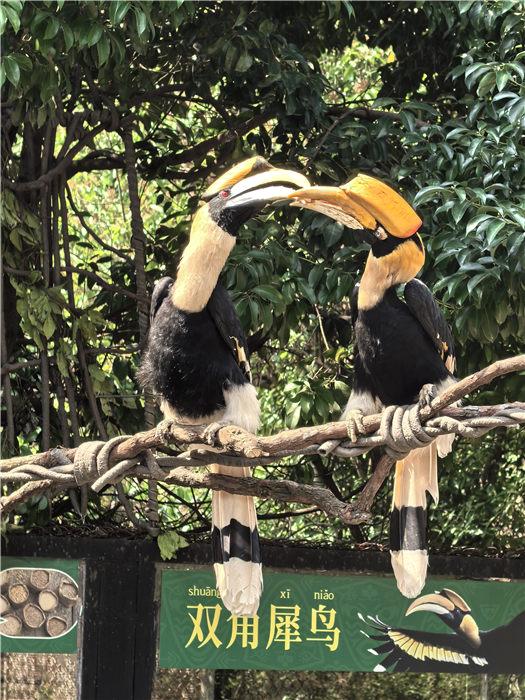 双角犀鸟是国家一级保护野生动物,在云南西部和西南部都有它们的身影。双角犀鸟一旦相爱就相伴一生,一般栖息于海拔1500米以下的低山和山脚平原常绿阔叶林,主要以各种热带植物的果实和种子为食,也吃大型昆虫、爬行类、鼠类等动物性食物。新展区的建成,不仅为双角犀鸟提供了更舒适的生活环境,也增进游客对珍稀鸟类的了解。