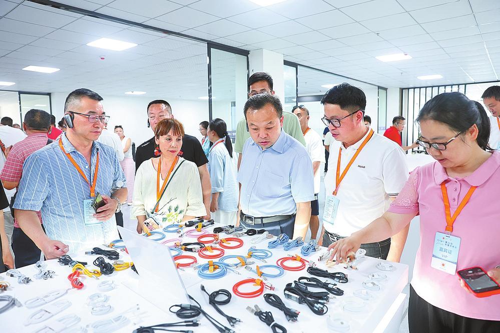 参会侨领侨商到瑞丽沿边产业园瑞丽市音皇电子科技有限公司考察。
