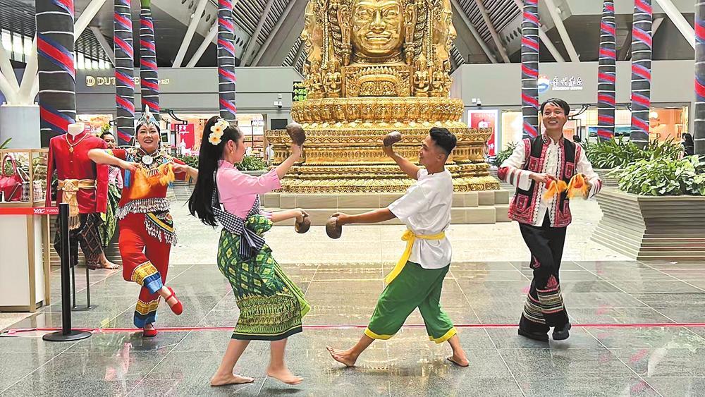 人潮涌动之时,中柬两国舞者身着传统服饰,以灵动快闪舞动丝路风情。柬埔寨椰壳舞律动轻快、云南彝族舞蹈马缨花热情澎湃、佤族甩发舞生命力十足,国际旅客纷纷驻足,录像留念。德国游客埃里克表示,佤族舞蹈颠覆了他之前对中国的认知,“没想到中国还有这样多的民族,以后一定要去看一看。”