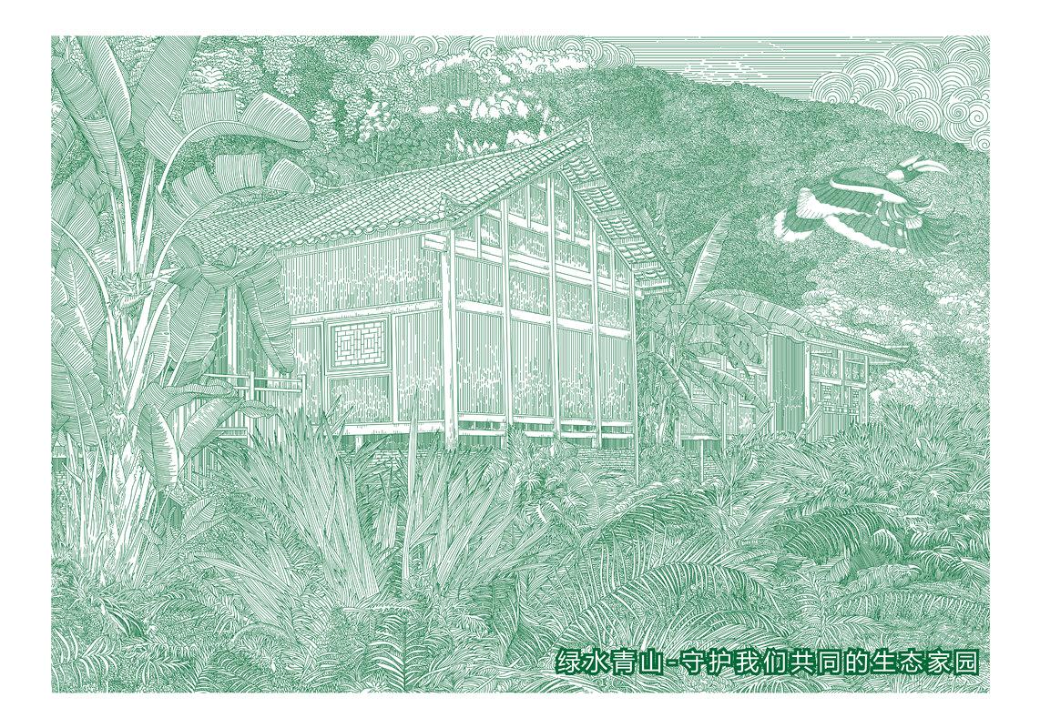 创意说明:作品以“绿水青山-守护我们共同的生态家园”为主题,展现了云南边境地区的生态之美。画面中,特色民居与繁茂植被、飞鸟和谐相融,既体现出当地良好的生态环境,也呼应了“兴滇润边”中对生态文明建设的重视,彰显出守护生态家园,方能让边境幸福模样永续的深意。