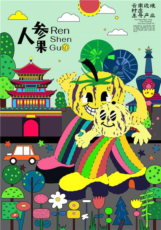 创意说明:作品以云南省绿春县平头镇大头村的主要种植水果人参果为主体,进行拟人化设计与处理,设计出两个可爱有趣的人参果卡通形象。选取了云南省代表性的建筑、部分植物进行装饰性概括,设计出一幅充满绚丽色彩与时尚的插图海报。