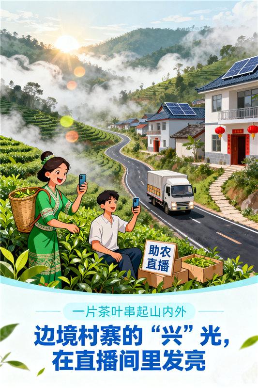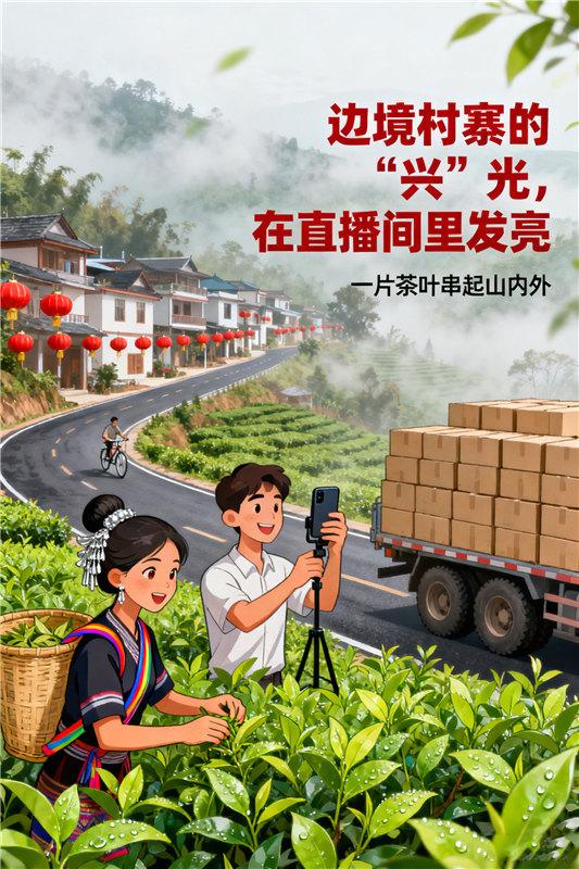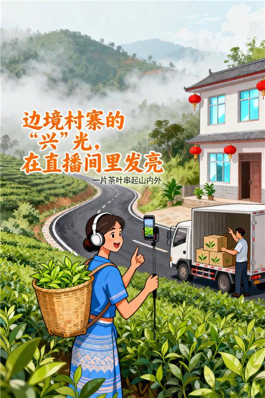 创意说明:晨雾中的云南边境茶园,傣族姑娘背着竹篓采摘春茶,身旁青年举着手机直播。远处村寨新修的柏油路通向山脚,货车正装载茶箱,背景是挂着红灯笼的新式民居,体现“一片茶叶串起山内外,边境村寨的 “兴” 光,在直播间里发亮“