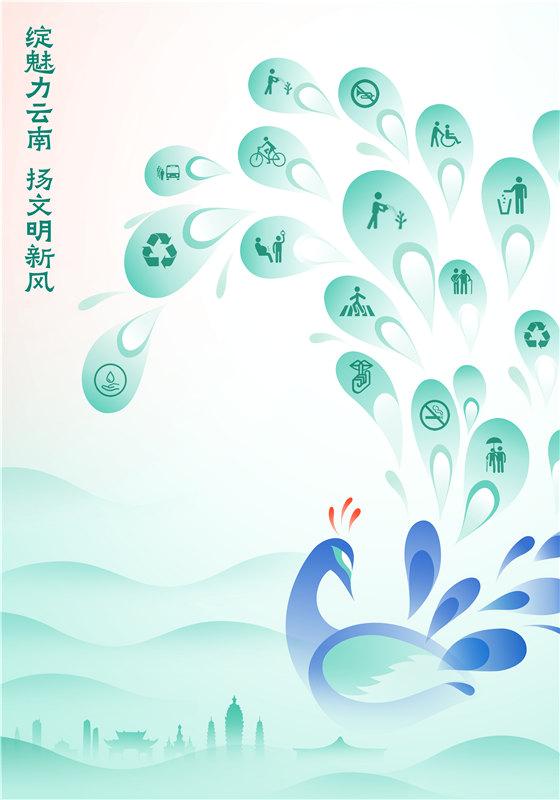 创意说明:将孔雀开屏元素与各种生态文明新风和助人为乐的图标相融合,画面下方是云南地区的剪影元素。云南景美,生态文明更美,作品用视觉语言生动表达“用生态文明扮靓云南”、“绽魅力云南,扬文明新风”这一创作主题。
