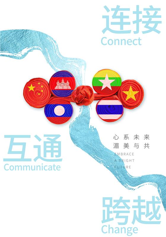 创意说明:海报用澜沧江、湄公河几个字里共有的三点水作为创意出发点,将澜沧江、湄公河用水连接起来,用以表达边境各国一衣带水,命运相连的主题。