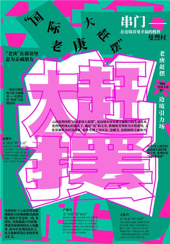 创意说明:海报以浓郁的在地文化与现代活力碰撞为核心设计理念,成功塑造了一个边境文化活动的鲜明视觉形象。整体版面采用稳固的“兴”字形结构,分别承载“治理兴”、“产业兴”、“文化兴”三大文本信息,信息层级清晰,逻辑一目了然。设计上大胆运用了高饱和度的撞色——充满生命力的绿色与热情奔放的玫红色相结合,既呼应了云南热带雨林的自然生态,也传递少数民族的欢快与激情,极具视觉冲击力。主体上以“兴”字的色块与“大赶摆”三个大字组合层级架构,从文本到图形结合传达强烈的视觉主题“大赶摆”,通过符号化的视觉语言和情感化的叙事方式,成功地将一个边境村落的振兴案例,转化为一场令人向往的文化盛宴。