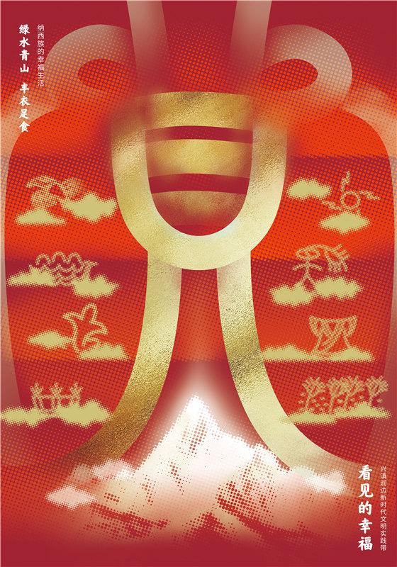 创意说明:通过纳西族的东巴文 “幸福”作为主图创意,融入意象汉字“见”,突出看见的幸福主题,也寓意民族大团结大融合。“幸福”文字中融入东巴文“绿水青山、丰衣足食”的寓意,以此突出兴滇润边新时代文明实践带的建设成就。