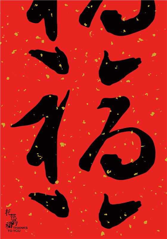 创意说明:“托您的福”常用来表达感恩及谦逊的语意。设计将福字笔画置换成打开的双手,托举起沉甸甸的幸福。此外,双手与福字笔划的共用及循环出现,也表达人人和美,福运连连的美好寓意。