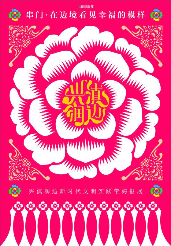 创意说明:《山茶花彩笺》剪纸海报以彩笺形式呈现,以山茶花为造型,“兴滇润边”字体设计为花蕊,“兴滇润边”新时代文明实践带建设,旨在通过文化浸润和文明实践促进边疆繁荣稳定,传递“兴边富民、润泽边疆”的目标,如山茶花般灿烂盛开璀璨绽放。
