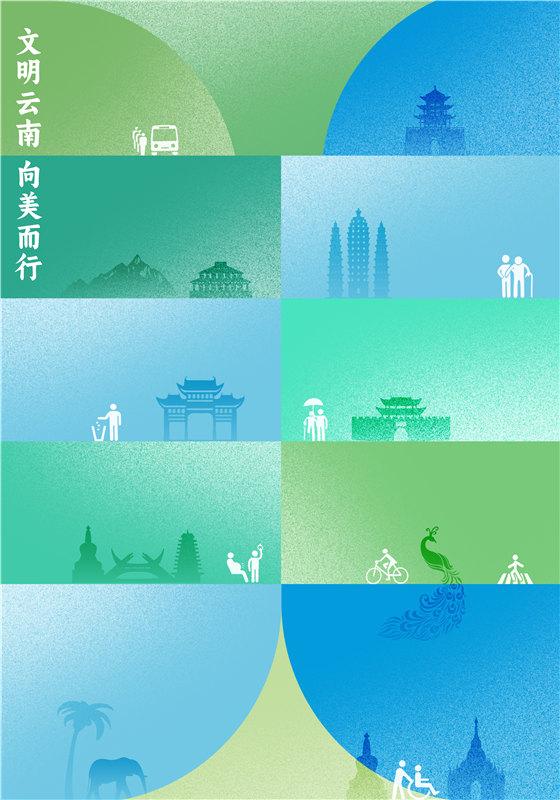 创意说明:将几何解构图形组成“美”的形意,同时融入云南各地域特色元素,作品形里有字,字里有景,各种文明行为的符号点缀其间,寓意文明新风让云南更美好。