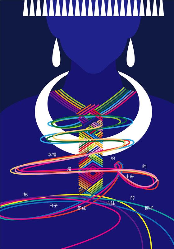 创意说明:利用苗族女性的织线,构成了“美”字,由织线在绣品上穿梭,隐约形成了向往的路。突出“把日子织成了向往的模样“这一宗旨。