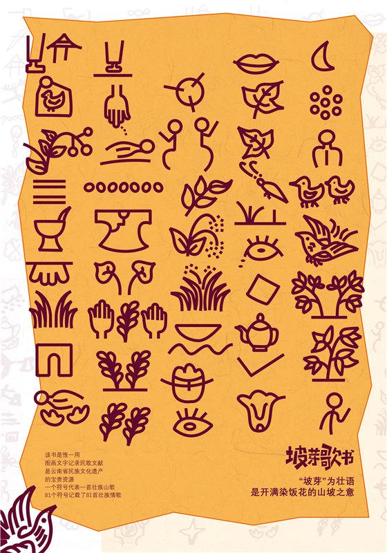 创意说明:坡芽歌书是流传在云南省富宁县壮族地区,以原始的图画文字将壮族民歌记录于土布上的民歌集。它是迄今为止发现的唯一用图画文字记录民歌的文献,它集中了壮族民歌的精华,承载着壮乡儿女天籁欢歌般的情爱密码,是壮族最优美的篇章。通过对坡芽歌书进行现代化设计,让更多的人了解和知道这一文化,传递爱和幸福。