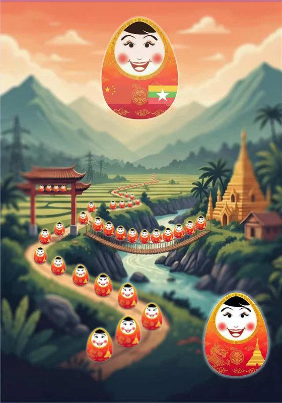创意说明:无论身处何种境遇,那个昂首挺胸、永不松懈的不倒翁,正象征着边境地区的经济繁荣与文化风貌。 这幅海报旨在成为连接缅中两国经济、社会与文化的桥梁,共同构建命运共同体。它亦是与云南省发展同步,促进边境地区繁荣、塑造新时代文化风尚的体现。边境地区是缅中经济走廊中的重要一环,通过区域特色产品、新兴产业,展现了云南省内边境乡村经济活动的活力,正呈现出崭新的时代面貌。