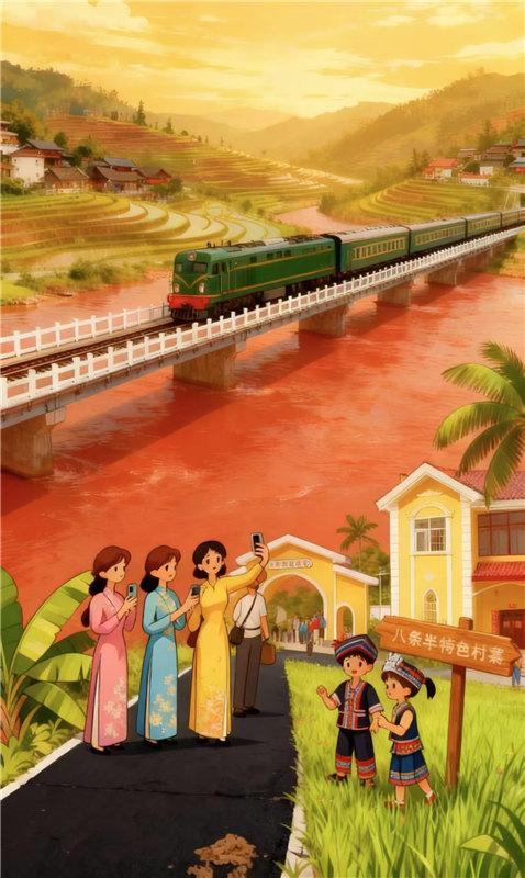 创意说明:本海报以“在中国八条半村,看见边境幸福的模样”为核心主题。画面采用精致的现代卡通风格,以象征友谊与发展的滇越铁路横跨红河为视觉纽带,将观者视线引向主角——八条半村。