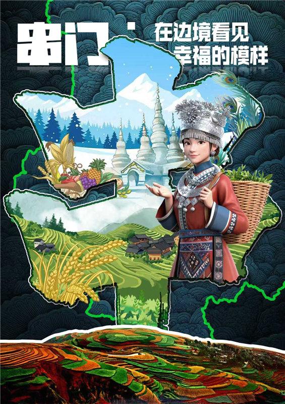 创意说明:这张海报以艺术化云南地图为核心,展现边境幸福图景。画面中,身着苗族服饰、银饰璀璨的女子肩背竹篮,地图内嵌入雪山森林、傣族佛塔、梯田稻穗与热带果篮等元素,底部是元阳梯田彩画。上方“串门:在边境看见幸福的模样”点明主题,整体以国潮插画风格,融合民族文化、自然景观与地域特色,尽显云南边境的多元魅力与幸福质感。
