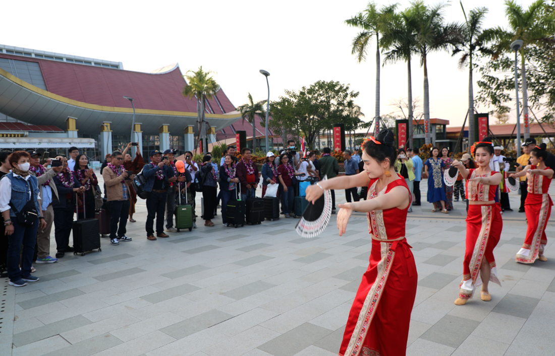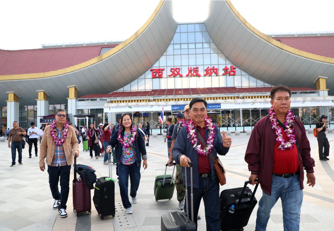 The 1st ASEAN tourist group reaches Xishuangbanna Railway Station on February 18.
