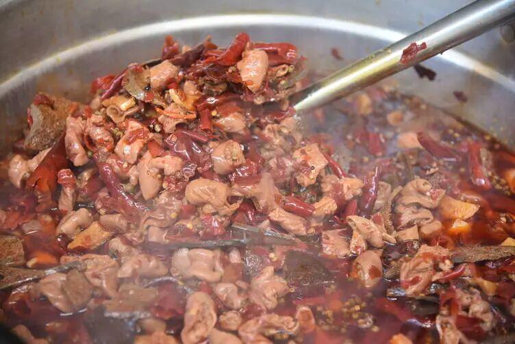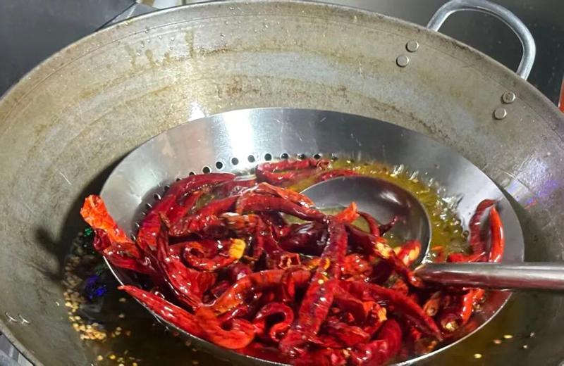 "Riverside Spicy" is made with locally sourced ingredients, including Lijiang's dried chilies, fresh pork intestines, air-dried pork liver, dried mushrooms, and dried pork skin. These are complemented by local seasonings such as Sichuan pepper, tsao-ko cardamom, star anise, and ginger. The preparation involves several key steps: washing, stir-frying, and stewing.