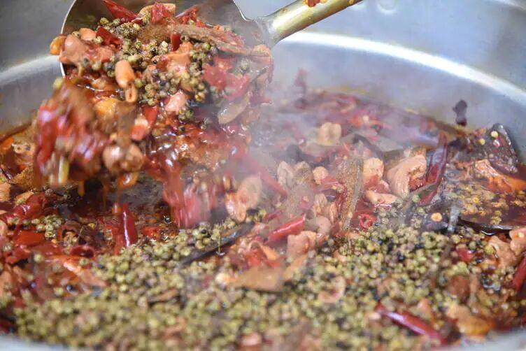 Sichuan pepper is added, and the slow-stewing process begins.