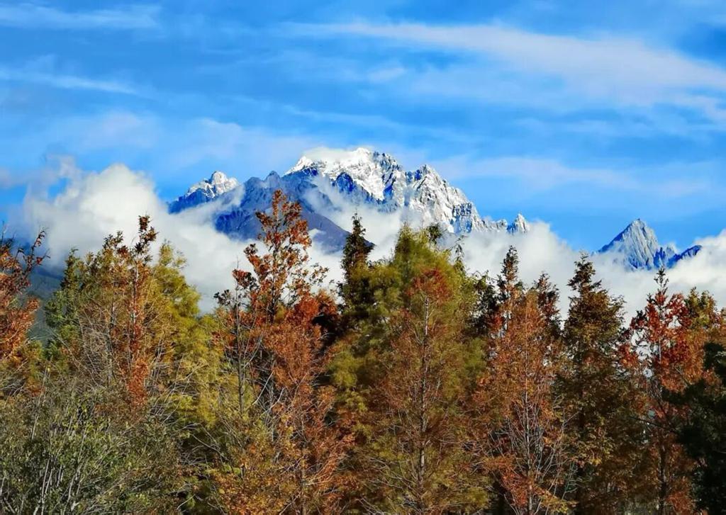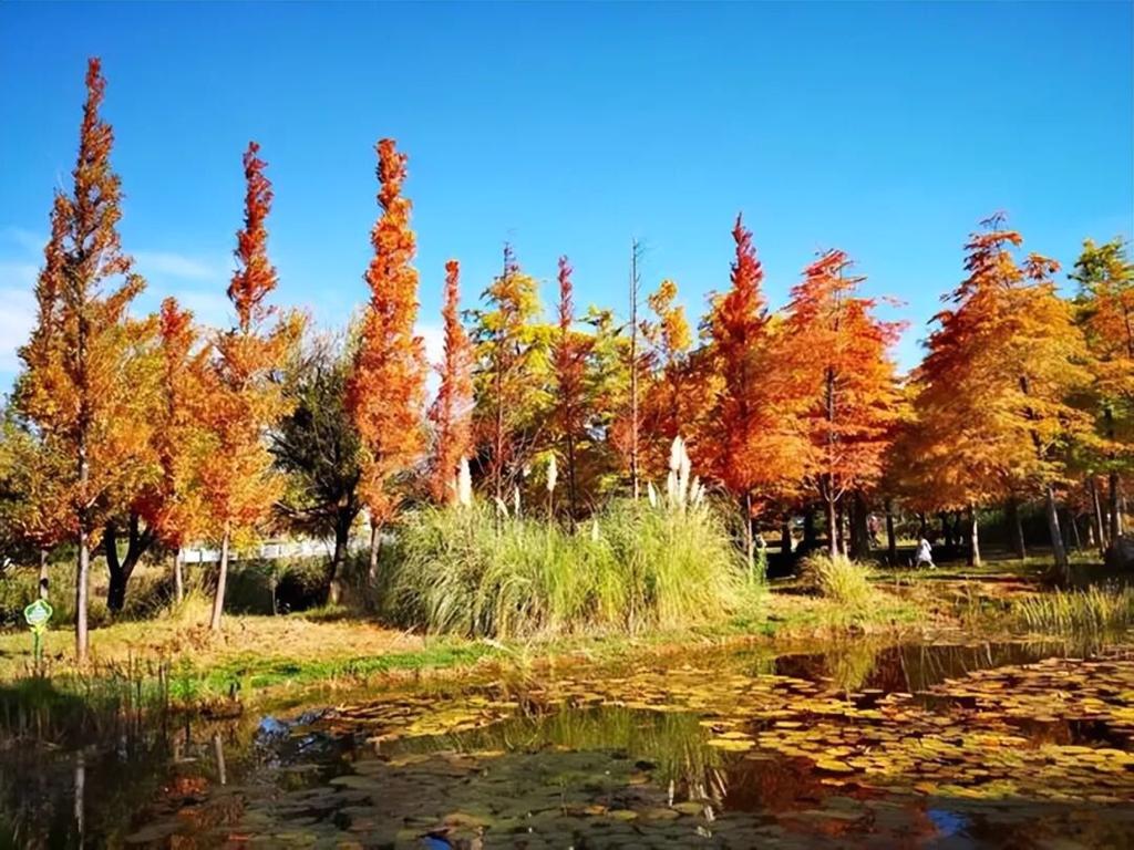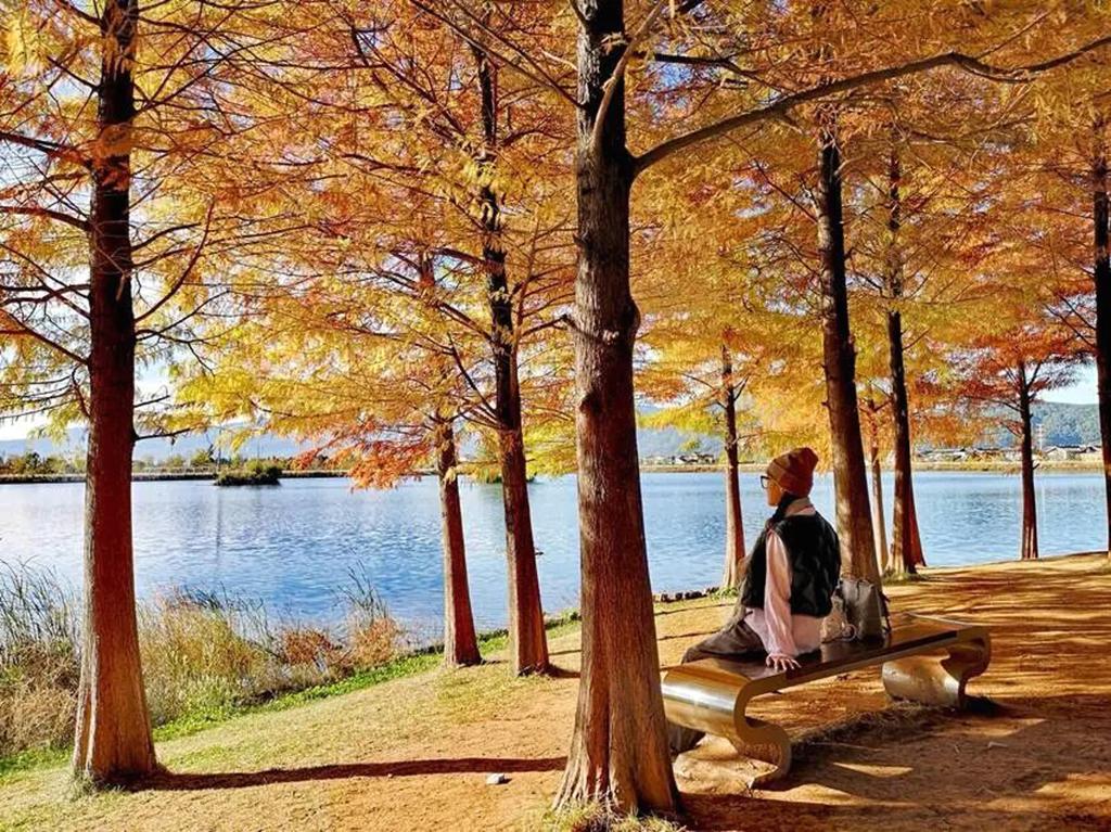 In early winter, the Zhongji Lake park in northwest Yunnan’s Lijiang city is presenting its best sights to visitors, with the lakeside metasequoia trees turning crimson and gold.