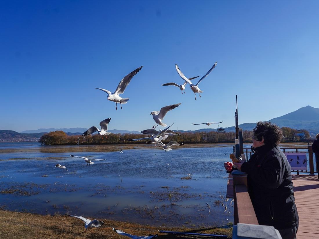 Hooded cranes, bar-headed geese and other rare birds are flying and foraging on the Lashihai lake in northwest Yunnan's Lijiang city nowadays, attracting photographers and tourists to the wetland area for bird watching.