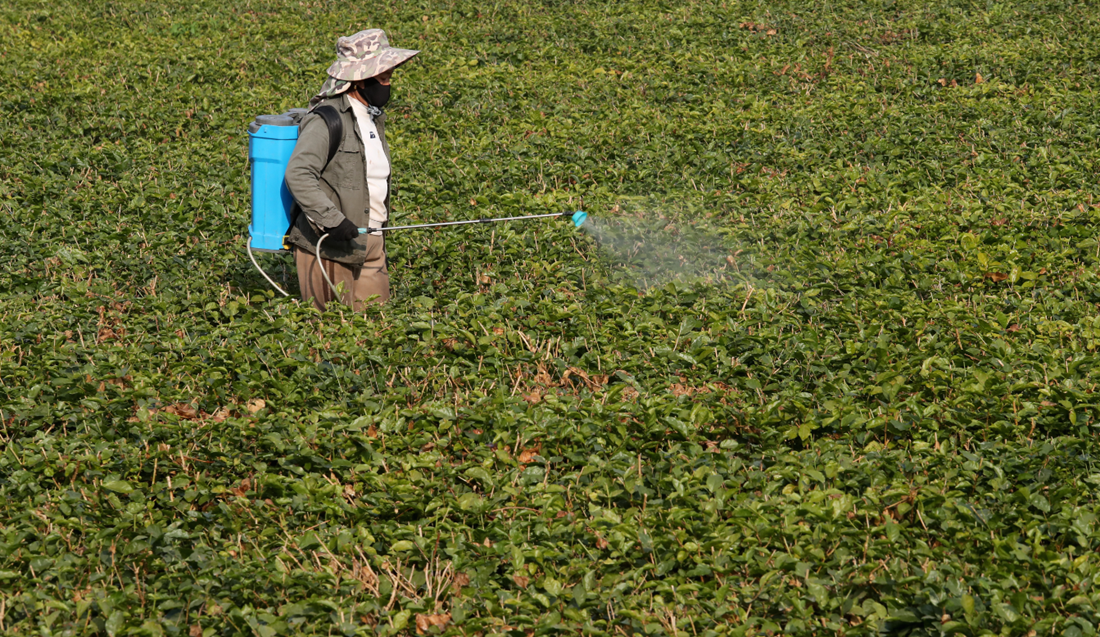 A farmer gets rid of pests at a jasmine plantation in Manlin village, central Yunnan’s Yuxi city.
