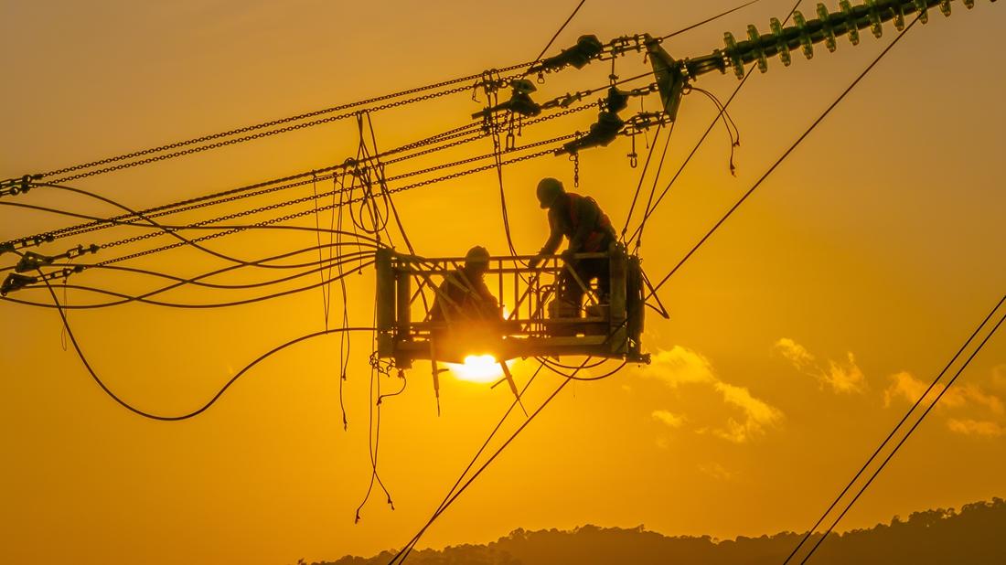 Workers operate on the China-Laos 500 kV Interconnection Project.