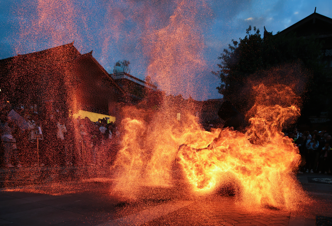 Sparks of molten iron warm up the festival air with traditional fire art.