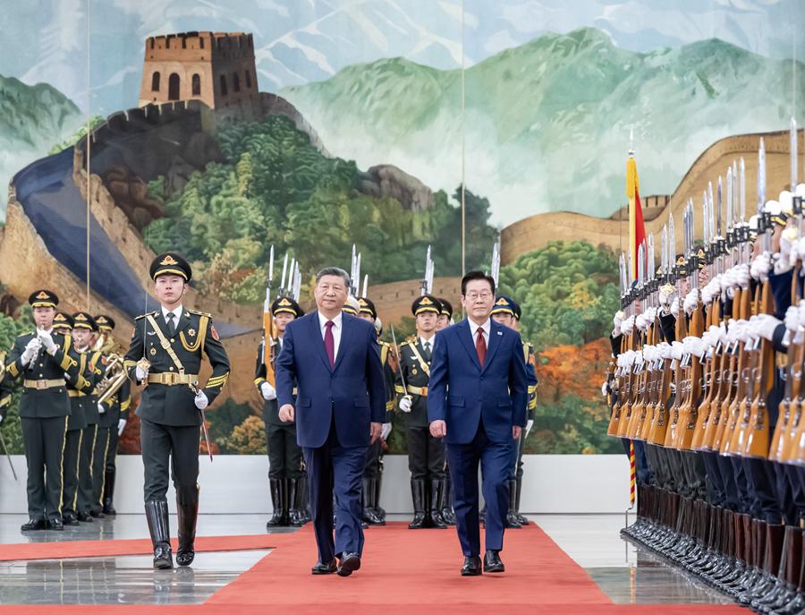 1月5日下午,国家主席习近平在北京人民大会堂同来华进行国事访问的韩国总统李在明举行会谈。这是会谈前,习近平在人民大会堂北大厅为李在明举行欢迎仪式。新华社记者 谢环驰 摄