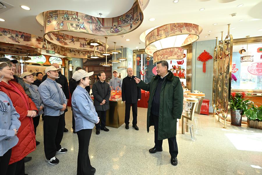 2月9日至10日,中共中央总书记、国家主席、中央军委主席习近平在北京考察并看望慰问基层干部群众。这是10日上午,习近平在东城区隆福寺街区的稻香村糕点店考察。新华社记者 谢环驰 摄