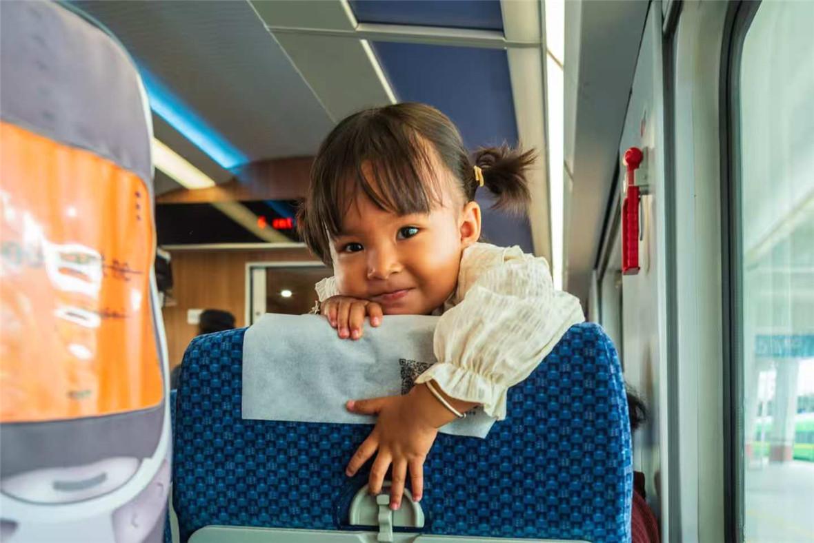 飞驰的中老铁路列车上,西双版纳傣族自治州的一位小女孩第一次坐高铁。她把脸贴在窗边,望向窗外流动的山水,眼睛亮晶晶,充满对外界的好奇。