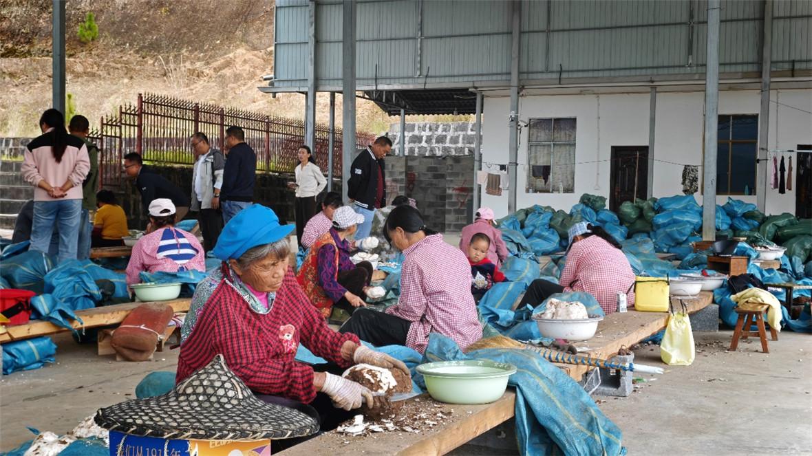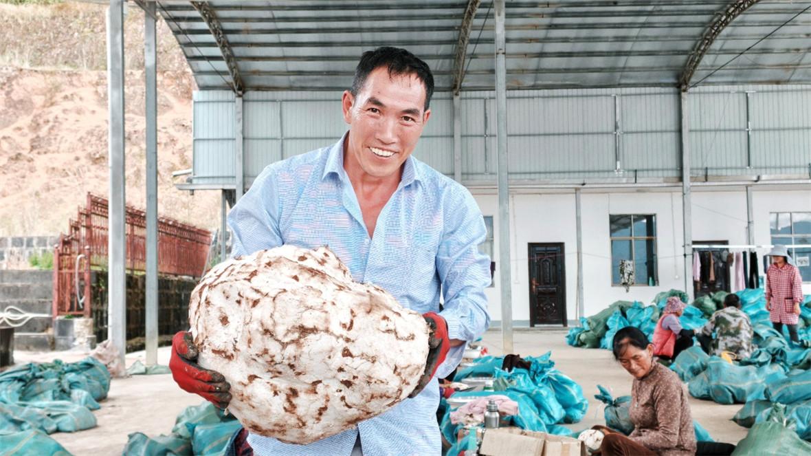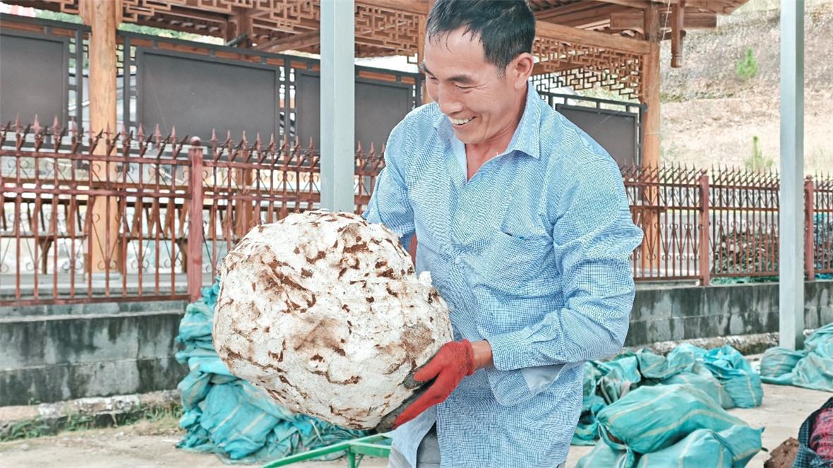 保山腾冲市明光镇麻栎村的茯苓加工厂内,长箐村民小组的村民举起一颗硕大的茯苓,笑得合不拢嘴。村里的“幸福车间”,让收获看得见、摸得着。