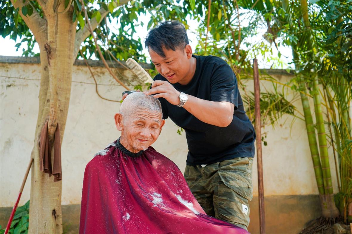 临沧市云县忙怀彝族布朗族乡敬老院的树荫下,理发店夫妻正为老人修理头发。“叔,您这真精神。” 树荫下的益剪,为老人省去了几里路的奔波。这件夫妻俩看作“该做的小事”,让暖意久久停留。