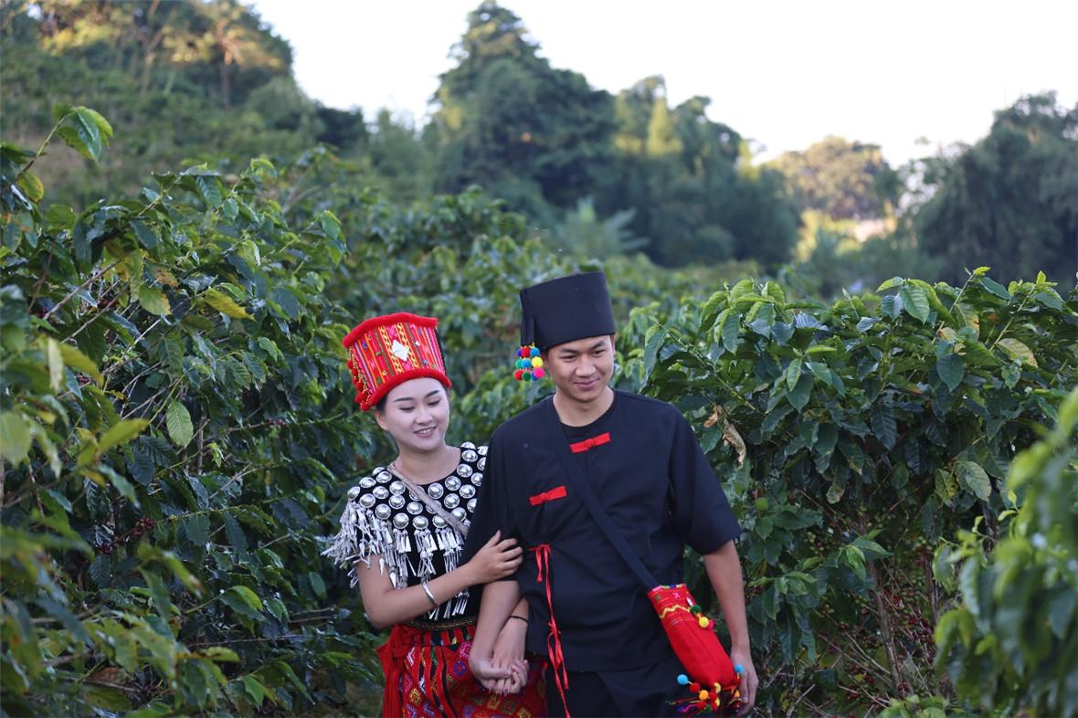 晨雾中,德宏盈江县太平镇石梯村的咖啡林间,阿妹与岩龙正采摘着熟透的咖啡豆。岩龙捏起一颗,轻声笑道:“这颗红得像去年送你的玛瑙坠子。等明年豆子再红,我就提着它去提亲。”山风拂过,将两人的笑语,酿进了丰收的季节。