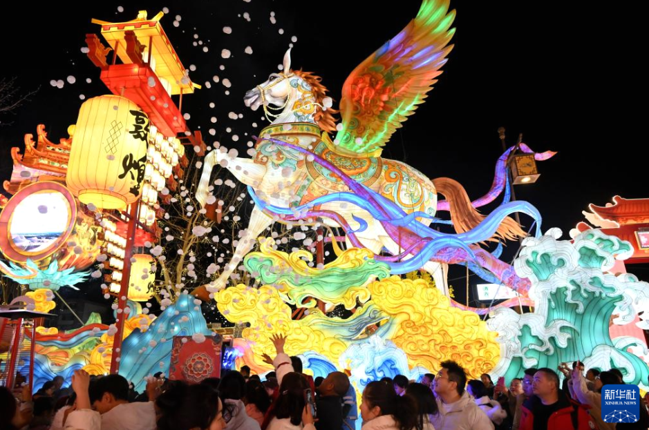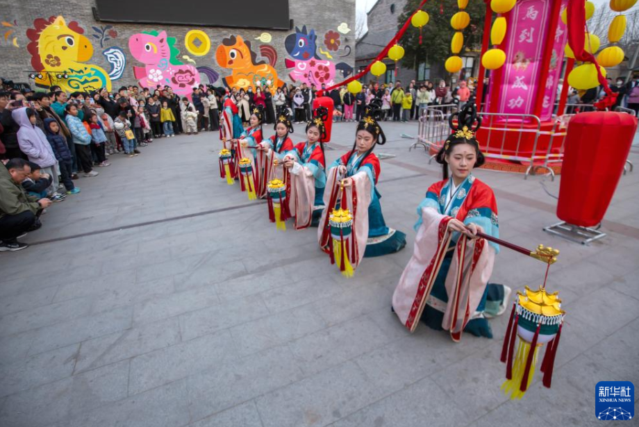 วันที่ 22 กุมภาพันธ์ นักท่องเที่ยวชมการแสดงระบำโคมไฟที่เมืองโบราณอันหยาง มณฑลเหอหนาน