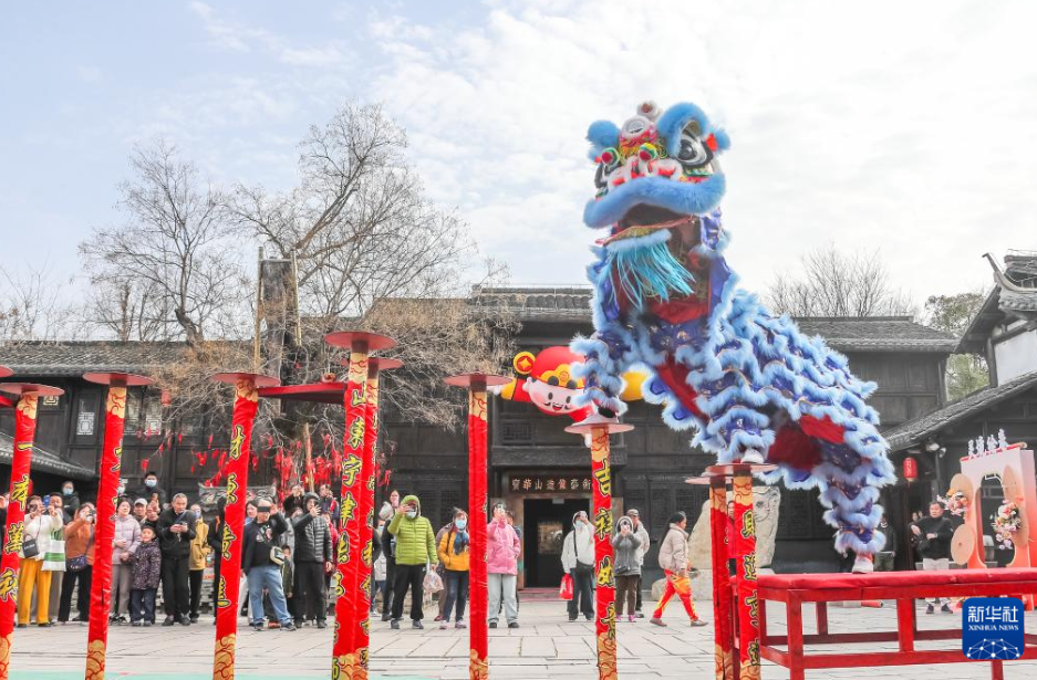 วันที่ 23 กุมภาพันธ์ นักท่องเที่ยวชมการแสดเชิดสิงโตที่อุทยานแห่งชาติป่าเป่าฮวาซาน เมืองจวี้หรง มณฑลเจียงซู