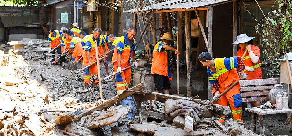 洪峰过去,受灾较为严重的重庆市江北区郭家沱街道在党员干部、社区志愿者、清洁工人等多股力量的齐心协力下,积极开展清淤消杀等灾后恢复重建工作。