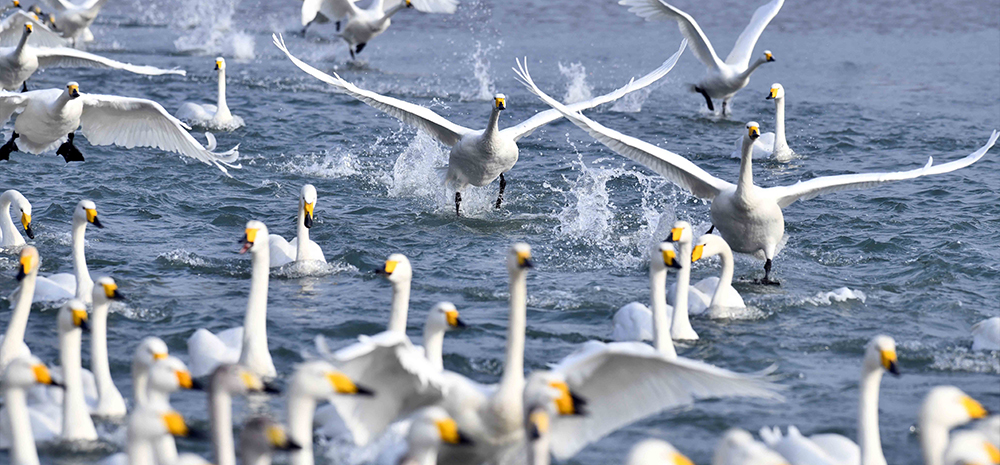 每年10月至次年3月,成千上万只大天鹅陆续从西伯利亚等地翩然飞临“中国大天鹅之乡”山东省荣成市栖息越冬。