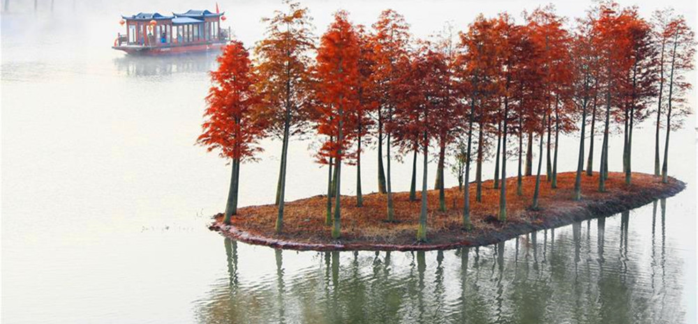 进入冬季,位于江苏中部的淮安市盱眙县天泉湖“水上森林”景区色彩斑斓,在景区游览,游人可体验“人在画中游”的美感。