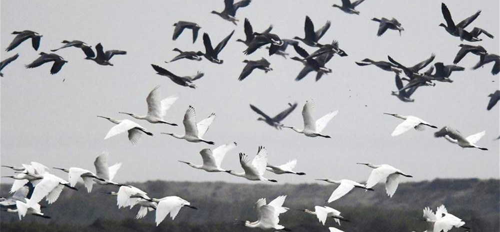 11月29日,候鸟在江西鄱阳湖南矶湿地国家级自然保护区飞翔。近日,大批南迁候鸟飞抵鄱阳湖栖息越冬。