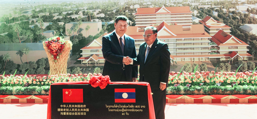中共中央总书记、国家主席习近平11月14日同老挝人民革命党中央委员会总书记、国家主席本扬在万象一道出席玛霍索综合医院奠基仪式。