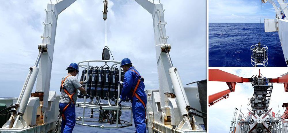 5月22日,中国大洋38航次科考队抵达马里亚纳海沟作业区,科考队员用温盐深仪(CTD)进行海水温度、盐度、深度等调查......