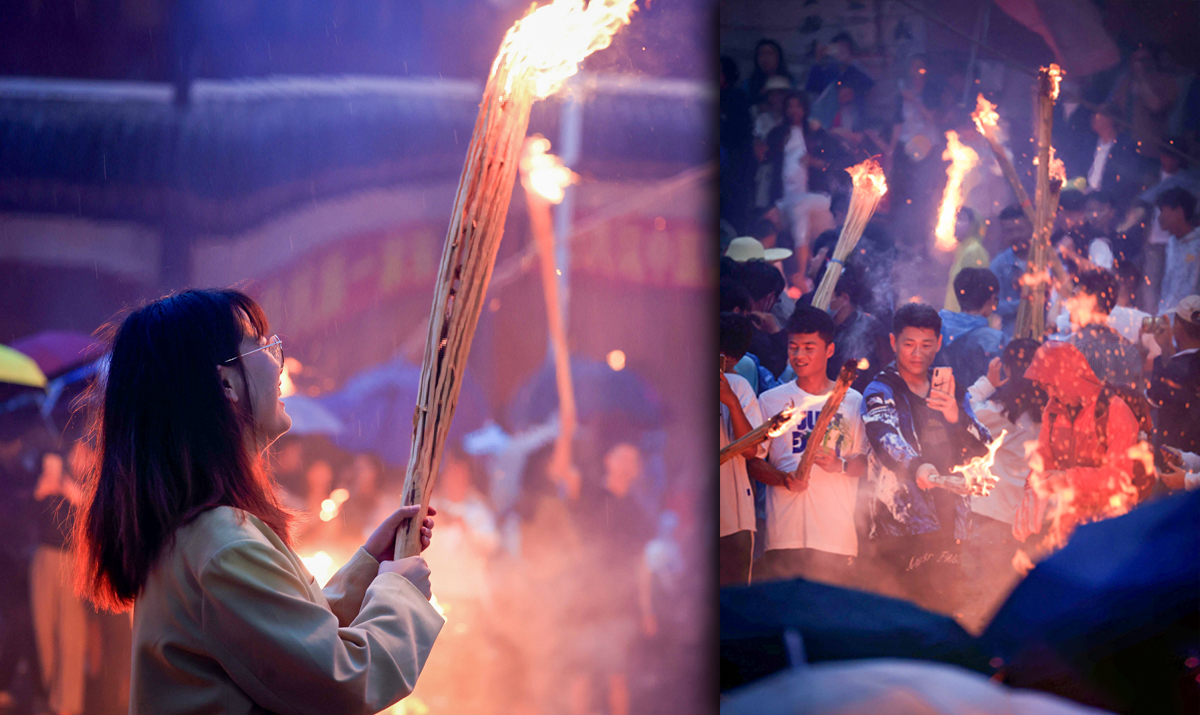 7月23日傍晚,在大理白族自治州喜洲镇周城村,白族男女围着火把载歌载舞,热情的舞步、欢快的歌声吸引了众多游客和当地百姓来此狂欢,当晚的周城村成了热情的海洋。