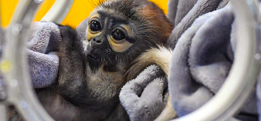 11月10日,国内首例人工繁育成功的黑腿白臀叶猴宝宝在广州长隆灵长类研究中心与观众见面,黑腿白臀叶猴宝宝出生于今年7月。
