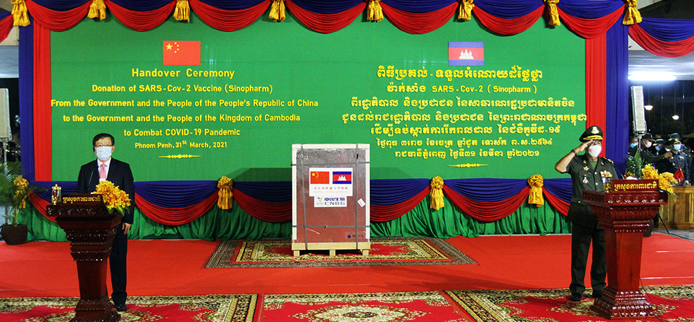 3月31日夜,柬埔寨政府在金边国际机场举行仪式,迎接中国政府和军队无偿援助的第二批新冠疫苗。