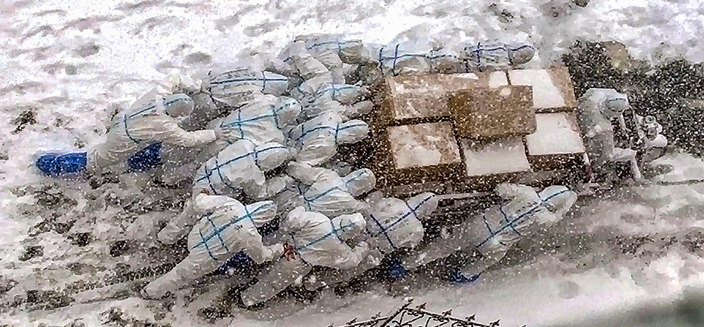 风雪中,10余名志愿者推着一车防疫物资艰难前行,身上的防护服与白雪融为一色,飘扬如絮的雪花不断覆盖着他们身后的脚印......